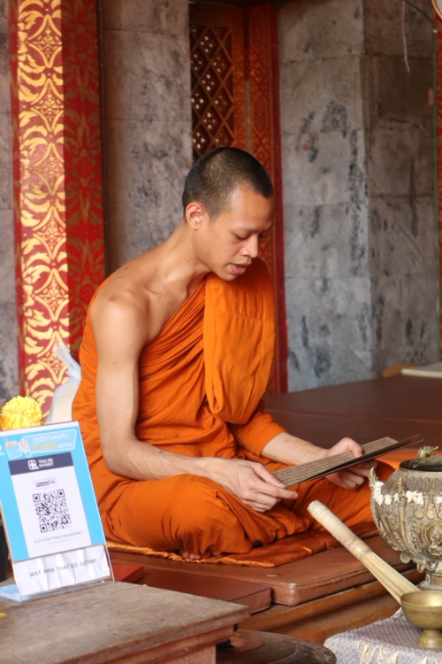 Notice the contrast of old and new. A Chanting Buddhist Monk next to a scannable code for information