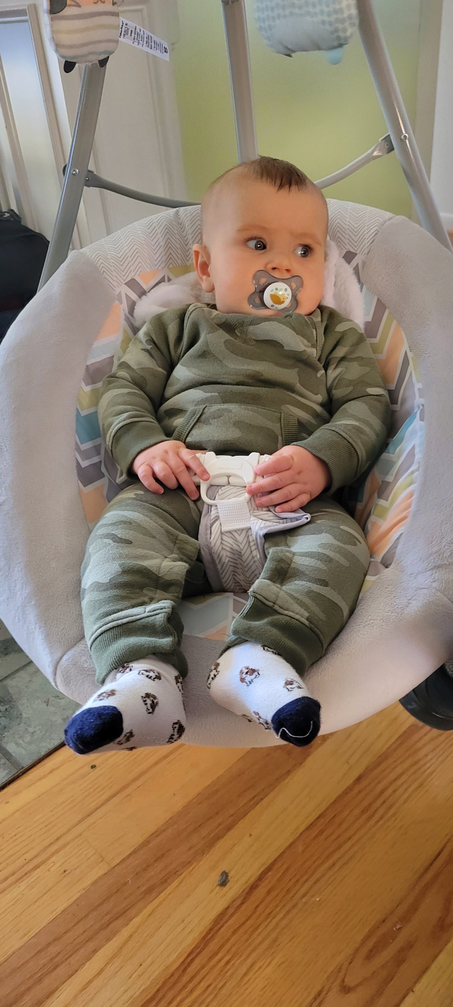And the peaceful, almost cherubic look on the little guy’s face is but a public relations ploy to conceal the devilish sense of humor unleashed as I try to dress him.