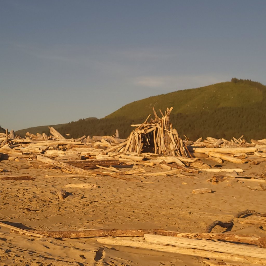 The scattered remains of downfall trees create an obstacle course on the way to the sand.