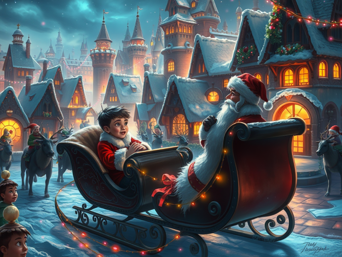 The sleigh descended in a gentle spiral, giving Joe a view of a brightly lit town bustling with elves and reindeer dashing here and there.